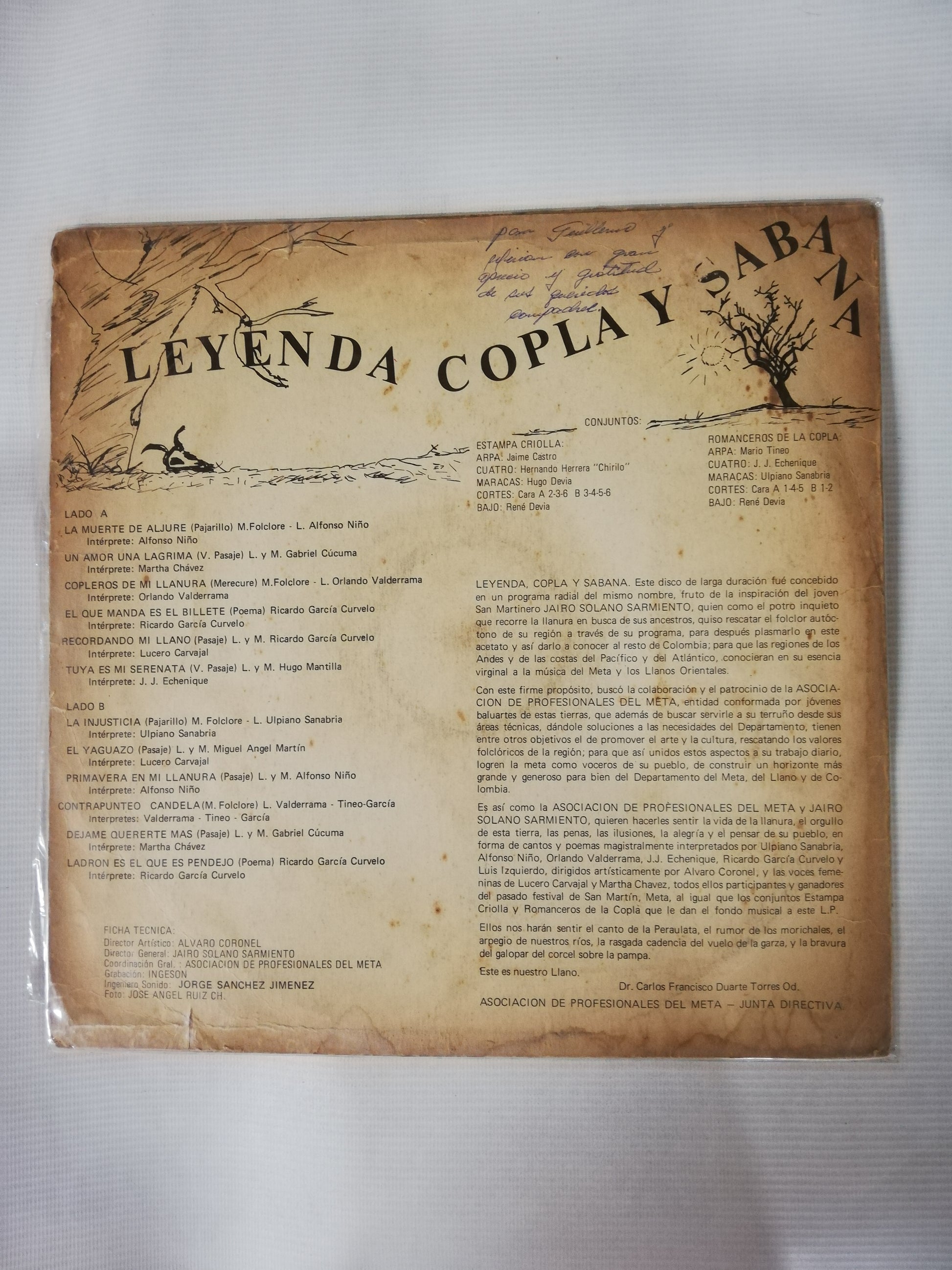 Acá les traigo esta otra Remembranza LLanera, la producción: LEYENDA COPLA Y SABANA. VOL1. Este trabajo fue concebido en un programa radial del mismo nombre que hacía en ese entonces, allá por los años de 1975- 76, en la ciudad de Villaviencencio fruto de la inspiración el joven San Martinero JAIRO SOLANO SARMIENTO, quien como el potro inquieto que recorre la llanura en busca de sus ancestros, quiso rescatar el folclor auténtico de su región a través de su programa, para despues plasmarlo en este acetato y así darlo a conocer al resto de Colombia; para que las regiones de los Andes y de las costas del Pacifico y del Atlántico, conocieran en su esencia virginal a la música del Meta y de los Llanos Orientales.